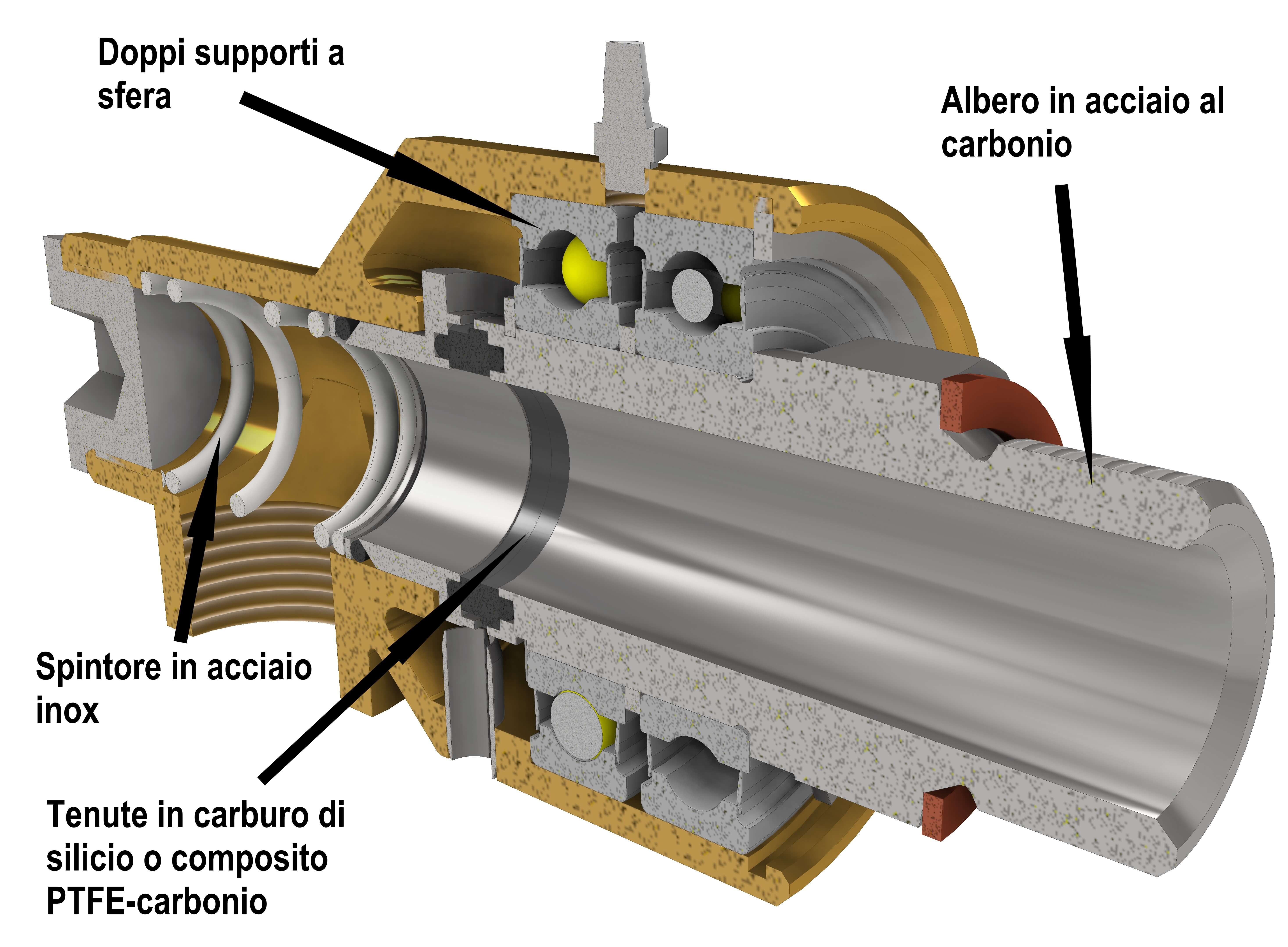 Nella costruzione di trasmissioni rotanti per la potenza fluida è fondamentale adottare tutti i criteri meccanici più evoluti allo scopo di mantenere la tenuta fluidica in modo ottimale e nel tempo. Per questa ragione, il disegno delle unità ALPHA AR prevede ben due supporti di banco allo scopo di contrastare le sollecitazioni di flessione dell’albero girevole, conservando in modo affidabile l’allineamento con le parti statiche. L’albero è realizzato in acciaio al carbonio e successivamente sottoposto a trattamento contro la corrosione allo scopo di mantenere costante il fattore di forma soprattutto a contatto con le tenute, evitando così le perdite. Allo stesso fine sono dedicate le speciali tenute in carburo di silicio od in composito PFTE-carbonio, a seconda delle versioni. La pressione costante delle tenute sull’albero girante è garantita da un robusto elemento elastico di grandi dimensioni realizzato in acciaio inox.
